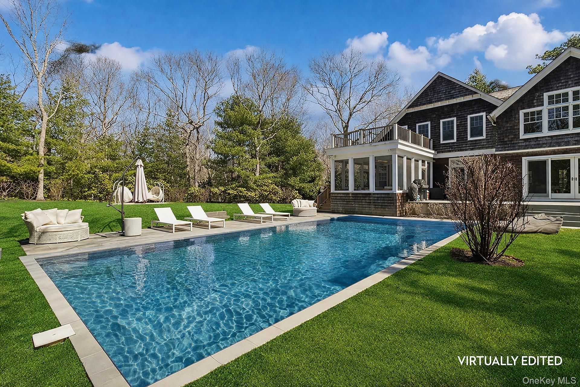 Set on 1.52+\- acres down a charming, quiet cul-de-sac at the fringe of East Hampton Village, this exceptional residence offers a rare combination of scale, privacy, and refined Hamptons living. Spanning approximately 4,650+\- square feet-with an additional 2,300+\- square feet of beautifully finished lower level-the home features 8 bedrooms and 6 bathrooms, thoughtfully designed for both relaxed living and effortless entertaining. A grand entrance welcomes you into an expansive open-concept living and dining area, highlighted by soaring ceilings, a fireplace, and walls of glass doors that frame picturesque views of the lush grounds. The eat-in kitchen flows seamlessly into a tranquil screened-in porch, creating the perfect setting for indoor-outdoor dining. The first-floor primary suite is a private retreat, complete with a spacious sitting room or library featuring a wood-burning fireplace, dramatic double-height ceilings, and direct access to the backyard. The upper level features a total of five well-appointed rooms, including an en suite junior master with a walk-in closet, and an additional ensuite guest bedroom. The finished lower level offers exceptional versatility, including a large recreation room that doubles as the eighth bedroom, complete with a full bath and double sliding doors leading to a secluded bluestone patio. The back grounds of the property have been extensively enhanced with all-new landscaping, a newly installed bluestone patio, and an inviting 18x40 swimming pool with a new liner. A firepit and multiple gathering areas provide ideal spaces for relaxation and entertaining, complemented by the convenience of a two-car garage. Adding to the sense of tranquility, a large reserve sits directly across the street, ensuring lasting privacy. Residents also enjoy access to two community tennis courts, now thoughtfully updated with pickleball markings. This is a rare opportunity to own a spacious and beautifully updated home in one of East Hampton's most desirable and peaceful settings, all with proximity to the Village.
