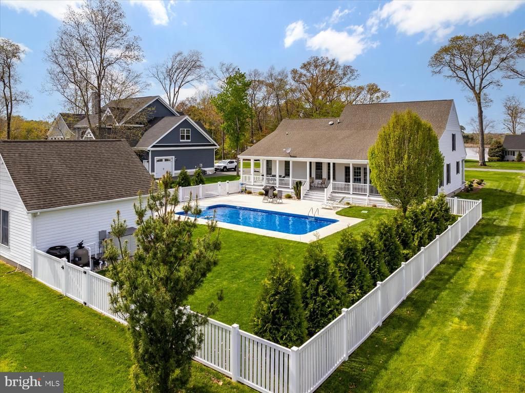 Amazing Coastal retreat now available in the waterfront community of The Point Farm. Enjoy Indian River Bay views from this move in ready, 4 bedroom, 3 full bathroom home with 2890 S/F of perfection. The open floor plan is perfect for any family with room for a 5th bedroom if needed. Fully equipped gourmet kitchen, Corian countertops, and breakfast bar/breakfast nook with great views of the Heated pool. Main level has 10' ceilings, hardwood floors throughout with a cozy living room, gas fireplace, formal dining room and master suite. Upstairs has 3 more guest bedrooms that share another full bath, all with great views of the pool or Bay and a bonus storage room over the attached 2 car garage. Sip morning coffee on your front porch with views of the water or for more space, enjoy the extra large back porch, overlooking your own private 18' x 36' - in ground, HEATED pool and new vinyl fence surrounding the pool . Recent Septic inspection completed. Separate, detached 400 sq. ft. with 100 amp electric garage has extra storage and with easy to clean epoxy floor. New Lawn irrigation system with new pump and extra sprinkler heads. New leaf filter gutter guards. 2nd Floor heat and air conditioning has been replaced 2025 Golf Carts are permitted, store your RV or Boat on side of property or in rear of the home. THESE SELLERS ARE MOTIVATED !!!