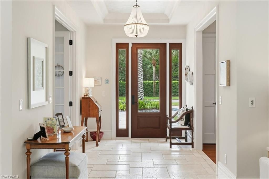 Welcome to 12888 Pond Apple Drive West, a stunning 4-bedroom plus den, 4.5-bath residence that combines timeless architecture with refined interiors, all set within a lush and private oasis. The stately exterior, featuring manicured landscaping, mature palms, and a paver circular driveway, makes an unforgettable first impression. Inside, light-filled living spaces boast soaring ceilings, intricate millwork, and dramatic coffered ceiling designs, exuding elegance and sophistication. The main living area is centered around a striking stone fireplace with custom built-ins, creating a warm yet polished focal point for both everyday living and entertaining. Wide-plank wood flooring flows seamlessly through the main living areas, enhancing the home’s inviting coastal charm. The gourmet kitchen is a chef’s dream, offering custom cabinetry, a spacious center island with seating, premium appliances, and designer lighting. Its open-concept design effortlessly connects to the living and dining areas, making it perfect for hosting gatherings of any size. Expansive windows and sliding glass doors flood the home with natural light and provide serene views of the outdoors. Designed for both comfort and versatility, the home also features an upstairs family room, ideal for additional living or recreational space. Step outside to your private outdoor retreat, where a resort-style pool and spa create the ultimate setting for relaxation and entertaining in true Southwest Florida style. Located in the prestigious Quail Creek community, this home offers access to a gated golf lifestyle with 36 holes of golf, which are set to undergo a complete renovation by 2027. Additionally, estate homes in the community will be updated within the next 24 months, further enhancing the neighborhood’s appeal. Just minutes from world-class shopping, dining, beaches, and top-rated schools, this residence delivers the perfect balance of luxury, privacy, and convenience.