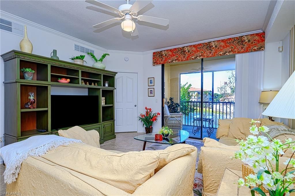 Nestled in central Naples along the desirable Livingston Rd corridor, this ever popular split 2bed/2bath Tuscany floorplan offers pool-side/lake-fountain features to better enjoy Naples dazzling sunsets from the comfort of your end unit lanai. Sold "As Is", furnished, with unique decorative details, this condo is equipped with full-size washer & dryer, stainless steel appliances, granite countertops and raised panel cabinetry throughout. Each bedroom has a lake view and walk-in closet. Newer HVAC system installed in 8/2024 and carries transferable extended warranty and service maintenance; new water heater installed in 11/2025. Price includes 1 of 5 attached garages - recessed with extended covered car space. Positano Place is a fiscally sound, gated and patrolled, pet friendly community with onsite property management, central elevator per building, and offers resort-style amenities, with proximity to many local points of interest, world-class shopping and dining and approximately 5 miles to beautiful Clam Pass beach. Combined condo + garage Quarterly fees ($2179) include: water/sewer/county trash collection/bundled internet/reserves. Association will be replacing all windows with hurricane impact windows.