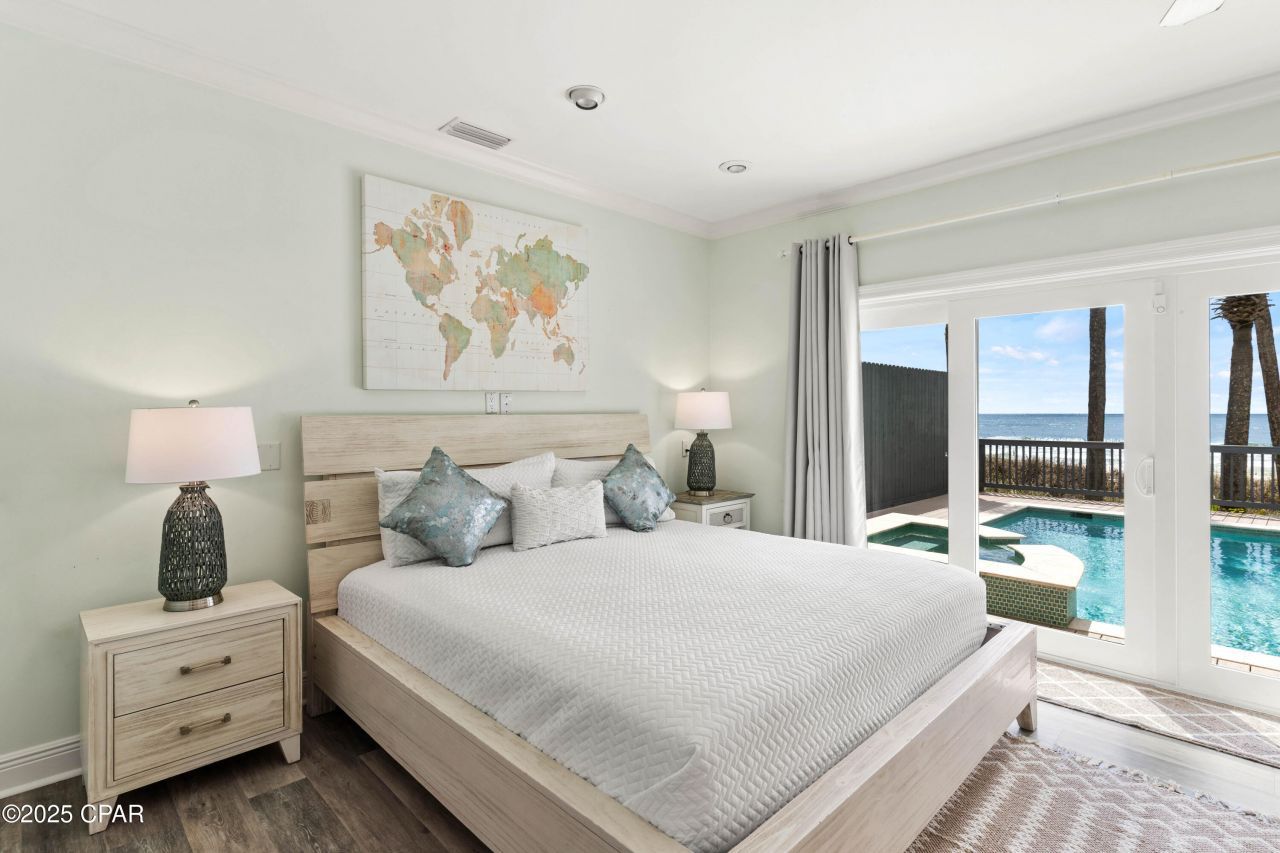Welcome to your private slice of gulf front paradise - or ''Parrotdise'' as this home's namesake for the original stained glass archway featuring a parrot in the main floor! Oleander Dr. is uniquely positioned in PCB as the only middle beach side street offering more privacy than any other road on our beach. This exclusive home is centrally located to both the east or west end with the adorable neighborhood park, Maggie Still, just a quick walk across the street. This beautifully furnished, turn-key retreat offers 60 feet of direct beach frontage and 2025 vacation rental bookings already on the calendar! Whether you're seeking an elegant coastal residence or a high-performing investment, this property delivers on every front. This exquisitely updated 4-bedroom, 4-bathroom estate includes a versatile bonus room complete with its own kitchenette on the second floor, ideal for multi-generational guests or group travel. Step outside to your resort-style backyard, where you'll find a custom automated heated pool and spa surrounded by composite-reinforced decking that seamlessly blends with panoramic Gulf views. It's the ultimate space for entertaining, relaxing, or soaking in the sunset. Additional highlights include: Spacious two-car garage with ample additional driveway parking Upgraded 400 amp electric service plus dedicated 50 amp RV hookup Automatic privacy gate and fully fenced yard for security and seclusion Luxury vinyl plank flooring on the main level Beautiful custom tile showers Outdoor shower for beach days made easy Whether you envision this as your full-time residence, a vacation oasis, or a luxury rental, 13211 Oleander Dr offers the best of Gulf Coast living with modern comforts, privacy, and undeniable charm.