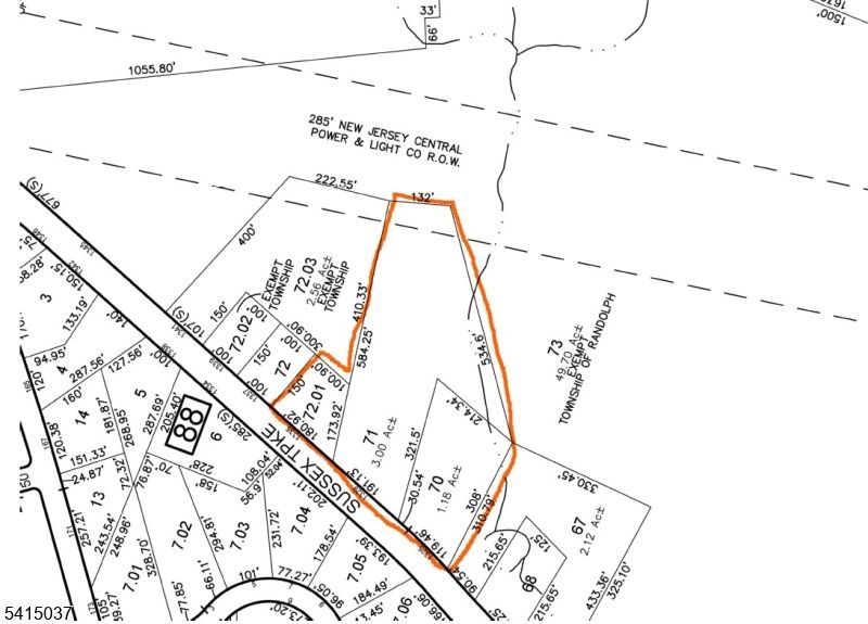 3 Lots on Sussex Tpke in Randolph totaling 4.664 acres. 1325 Sussex Tpke, 1329 Sussex Tpke, & 1335 Sussex Tpke, all residentially zoned R-2. Backs to Brundage Park. Over 490 ft of street frontage. Public water and natural gas lines confirmed in the street with the township. There is a home on the lot of 1329, in need of major repair, which can be shown upon second visit. May not qualify for conventional financing. Some wetlands at the back of the property. Buyer responsible for all due dilligence. Seller would also consider sale of the lots individually.