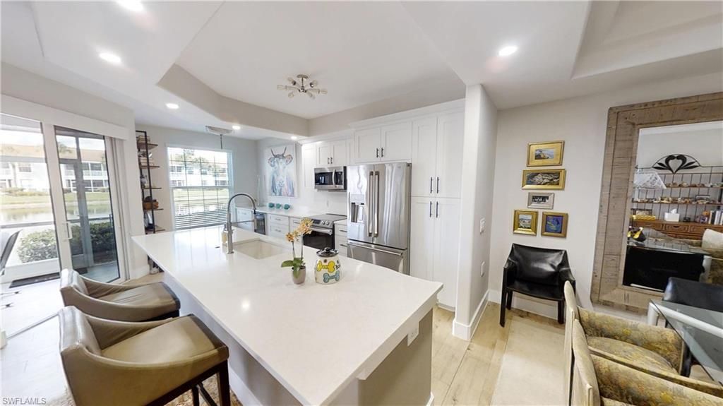 Meticulously maintained Ibis floorplan with spectacular long water views and a private first-floor entrance. This pristine 2-bedroom plus den, 2-bath condo lives like a coach home, with a paver-brick driveway, courtyard entry, and attached garage. Walls of glass sliders along the back of the residence fill the home with natural light and frame the tranquil lake setting. Inside, imported wood-look plank tile runs throughout, complemented by upgraded doors, trim, hinges, hardware, and taller baseboards for a clean, updated look. The redesigned kitchen features an oversized island, extended cabinetry, quartz countertops, and quartz backsplash, a Kohler Pro faucet, and stainless-steel appliances, including an upgraded Electrolux refrigerator. Additional details include LED recessed lighting with small-aperture cans, custom valances and shades, new ceiling fans, and designer Philip Starck pendant lighting in the dining area. The primary suite offers water views and access to the lanai, with PGT high-impact hurricane sliders and custom window treatments for peace of mind and comfort. The spa-like primary bath was reimagined with raised custom cabinetry, an elegant tiled shower with seamless glass, a soaking tub surrounded by rich, imported floor-to-ceiling tile, and new toilets, sinks, and faucets. The split floor plan features a private guest wing with easy access to the remodeled guest bath, ideal for visitors. Practical upgrades continue with PGT high-impact hurricane windows throughout, an epoxy-coated garage floor, and NewAge garage storage systems for organized, turnkey living. Residents can also relax at the nearby resort-style pool, spa, and cabana for effortless vacation-at-home living. Living in Pelican Marsh means a vibrant, amenity-rich lifestyle in one of Naples premier gated communities, just minutes from Mercato, Waterside Shops, Shoppes at Vanderbilt, Artis Naples, and the area’s white sand beaches. Enjoy 8 lighted Har-Tru tennis courts with pro shop and instruction, 6 lighted pickleball courts, 3 bocce courts with leagues and workshops, a state-of-the-art fitness center with trainers & spa services, walking and biking paths through 100+ acres of preserves, and an on-site restaurant offering weekly entertainment. The full-time social directors offer year-round events at the community center. Experience the best of Florida living in a nationally recognized master-planned community. Schedule your private showing today.