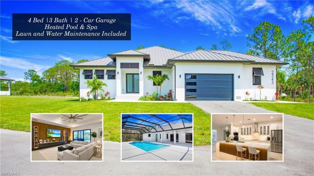 2025 new construction residence in Golden Gate Estates offering 5 bedrooms plus den, 5 bathrooms, and approximately 3,590 square feet of living space on 2.09 acres. The main residence features 4 bedrooms, 3 bathrooms, a 2-car garage, and an open-concept layout with modern finishes throughout. A separate suite includes its own kitchen, bedroom, and bathroom, providing flexibility for multi-generational living or private guest accommodations. The outdoor living area is designed for year-round enjoyment with a heated concrete pool, spa, and screened lanai overlooking a peaceful water feature and wooded surroundings. Constructed with concrete block, impact-resistant windows and doors, and a metal roof for durability and efficiency. No HOA restrictions. Space available for boats, RVs, and horses. Owner covers lawn care, lawn service, and water system maintenance. Conveniently located near shopping, dining, and Big Corkscrew Regional Park with easy access to major roadways. Long-term rental available at $6,000 per month.