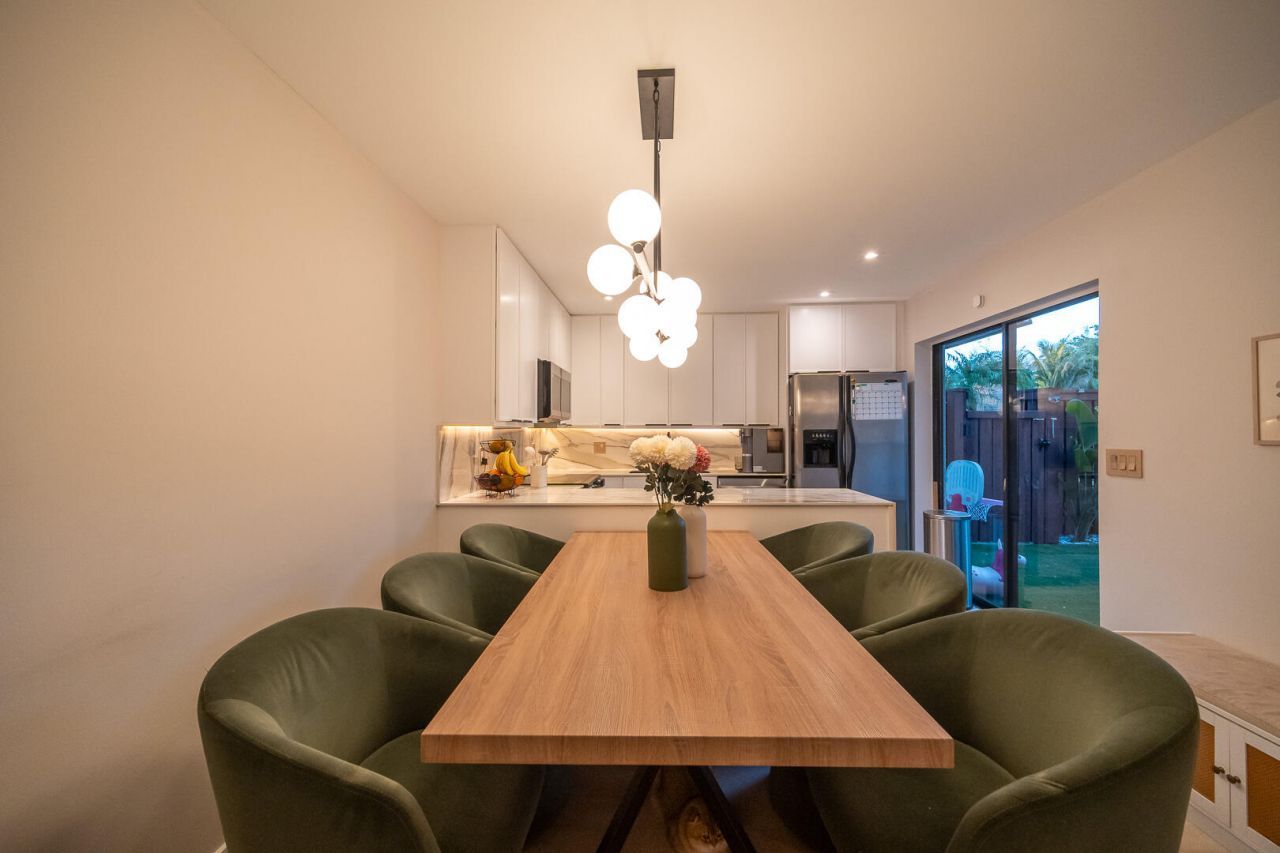 This beautifully updated unit features a bright open-concept layout, sleek contemporary kitchen with custom cabinetry, quartz countertops, stainless steel appliances, and stylish lighting fixtures. The full-height quartz backsplash adds a seamless, high-end look, while under-cabinet lighting enhances both ambiance and practicality. The oversized island offers abundant storage and seating space, making it perfect for entertaining, casual dining, or family gatherings. Light wood flooring and designer lighting tie everything together, creating a bright, sophisticated, and move-in-ready kitchen that truly serves as the heart of the home. The living and dining areas flow seamlessly, creating a perfect space for both everyday living and entertaining. Both bathrooms have been tastefully renovated