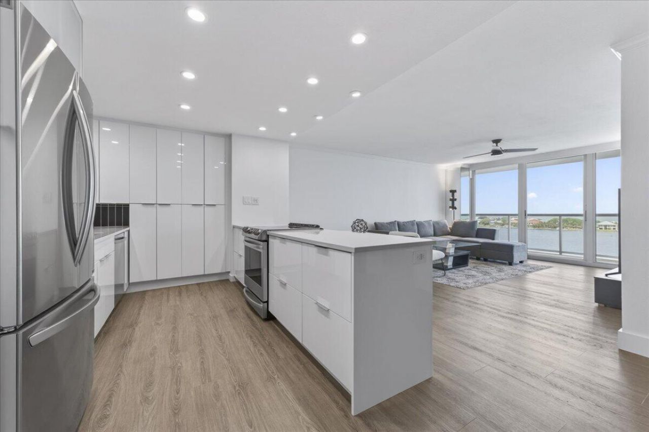 Perched on the eighth floor, this beautifully remodeled condo offers sweeping views of Little Sabine Bay with convenient Gulf beach access just across the street! See the MLS docs for a full list of upgrades. Enjoy the coastal scenery from the expansive 31'10'' x 5' private balcony. Whether you're looking for a primary residence or short-term rental opportunity (rental projections coming in at $41K+), this unit is a showstopper. Inside, the unit showcases a sleek black and white interior with cohesive flooring throughout, crisp white walls, recessed lighting, and striking black accent doors for a clean, modern aesthetic. For added quietness throughout, the doors are solid core doors, while the windows and sliding glass doors are high impact hurricane rated. Other major updates include a 20 water heater and 2026 HVAC. The kitchen features glossy flat-panel cabinetry, tiled black modern backsplash, quartz countertops, stainless steel appliances, and copious storage. The bedroom is generously sized with direct balcony access and two closets equipped with built-ins. The bathroom is equally impressive, offering a quartz topped double vanity, a tiled standing shower, and cleverly designed storage. The community amenities are unmatched for Pensacola Beach, including a pool, boat launch, fitness center, sauna, tennis, pickleball and basketball courts, kayak storage, fishing dock, grill area, and a community room that accommodates up to 50 guests. Additional features include open parking, elevators, trash chutes, a 3x3 private storage area, and on-site management. All of this is just moments from the dining, entertainment, and attractions that make Pensacola Beach so desirable!