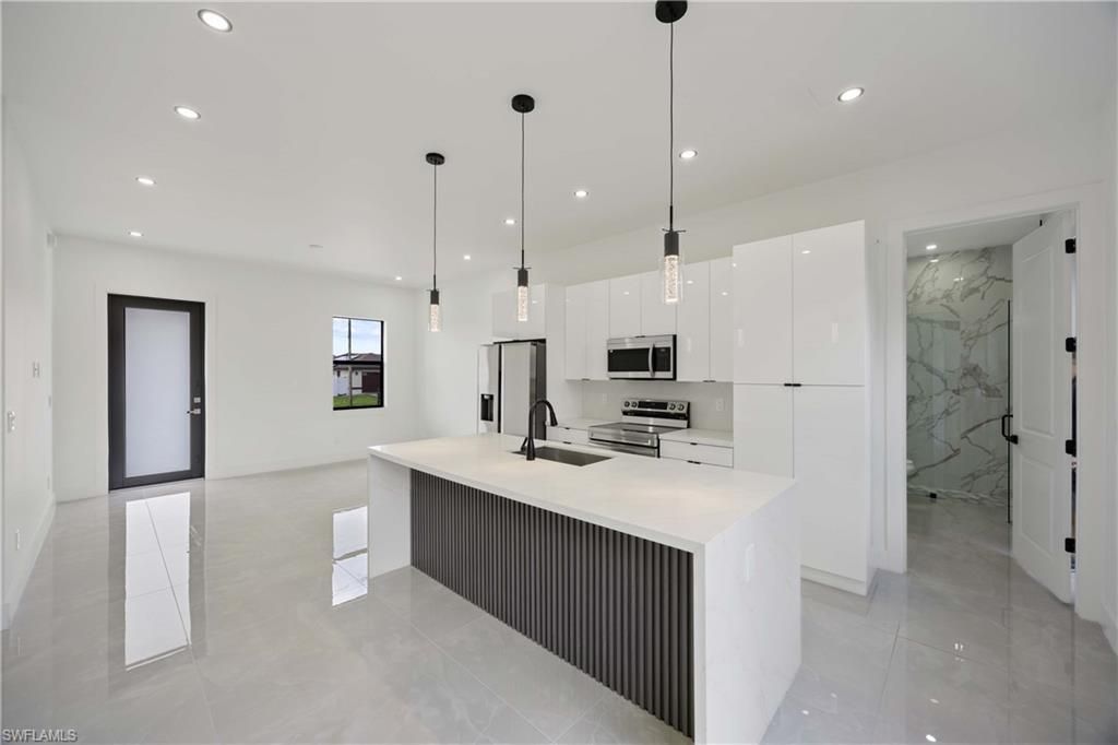 NEW CONSTRUCTION RENTAL, luxurious contemporary home with plenty of room for parking and located in the heart of Lehigh Acres. This home is impeccably designed and built with attention to every detail. All lights throughout the home are LED, all doors and windows are high impact and includes a sprinkler system. The open floor plan seamlessly blends indoor & outdoor living. Impeccable white 36x36 porcelain title floors and expansive living room with high 8" interior and exterior doors. The kitchen boasts gorgeous 42" solid wood soft close cabinets with quartz countertops, a broad counter height island along with stainless steel appliances. This home is close to shops, restaurants, schools and THE BEST SW FLORIDA CAN OFFER.