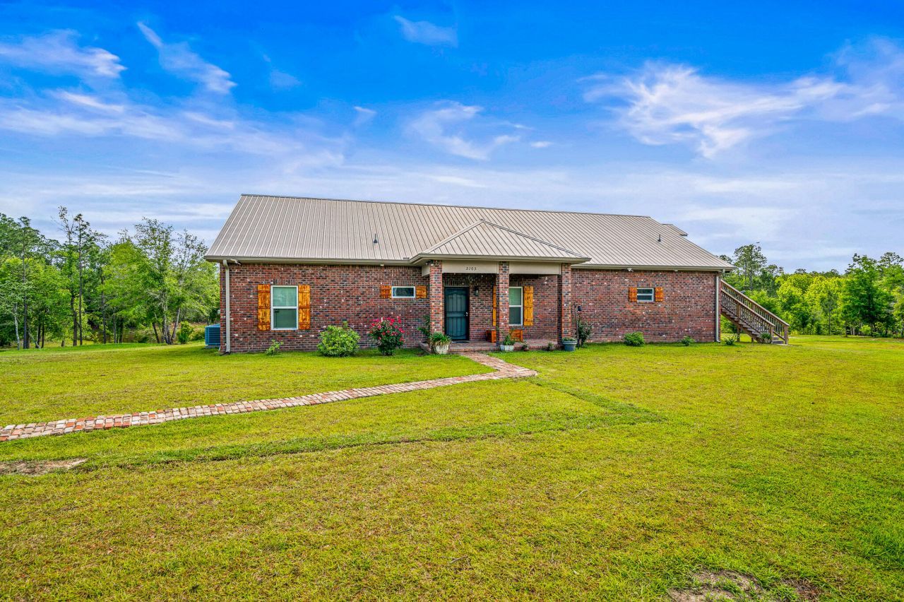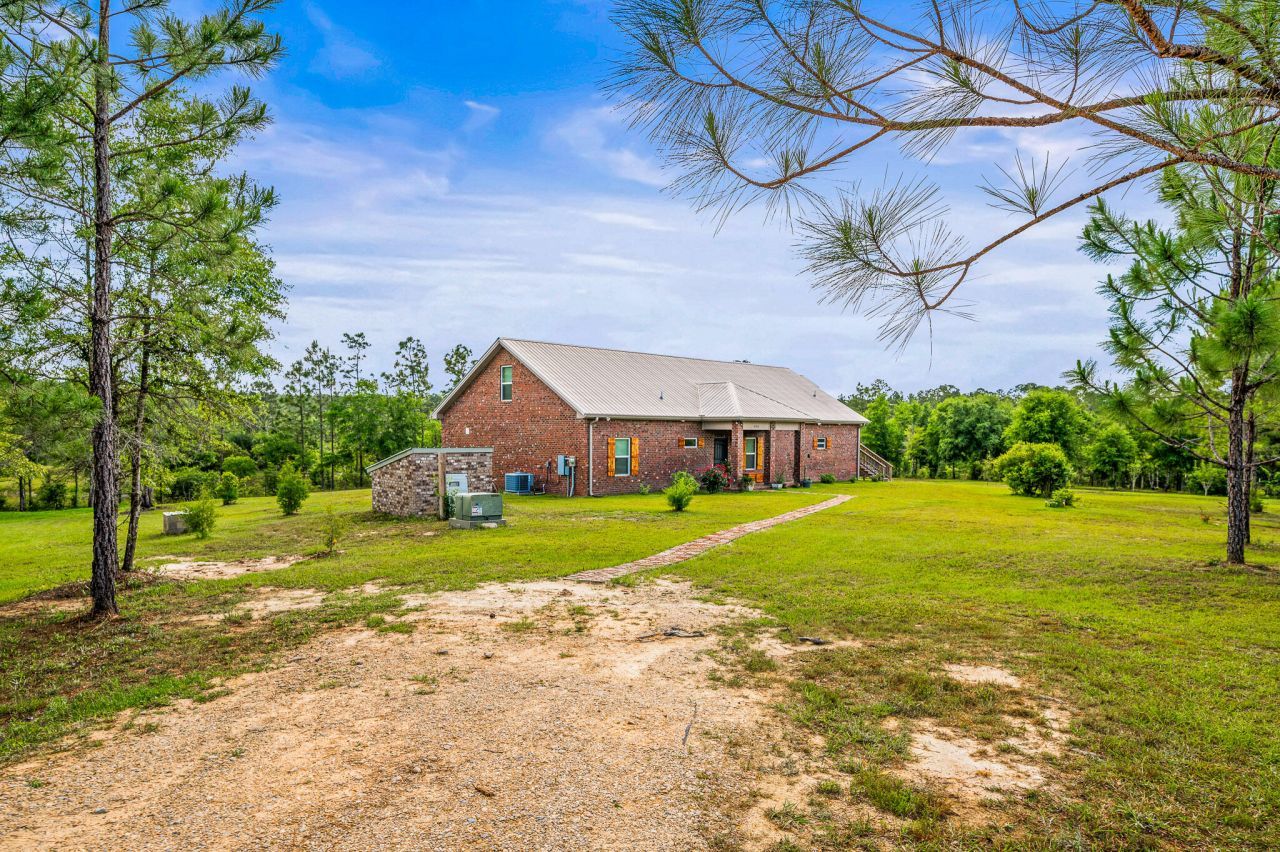Incredible 40+ acre homestead and wildlife paradise-where comfort, self-sufficiency, and nature live in harmony. This all-brick custom home offers over 4,000 sq ft of quality craftsmanship, construction and thoughtful design. The open, split-bedroom layout includes a spacious primary suite with tiled walk-in closet. The kitchen features solid wood, soft close cabinets, stainless appliances, smooth-top stove, and a walk-in pantry/safe room. There's a natural wood breakfast bar, a dining area, 9' ceilings and crown molding, full guest bathroom, recessed lighting and wood look, ceramic tiled floor throughout. Plus, bull nosed corners, and impact resistant/wind rated windows. Upstairs includes 2 additional bedrooms, full bath, and room for an office or gaming space. One bedroom opens to a private porch, offering tranquil views of the windmill and surrounding landscape. There is extensive storage throughout, plus downstairs covered porch overlooking the ponds. A massive 80x40, pole barn provides workshop space, and generous covered parking for vehicles, RV and equipment. Above is a 960 sq. ft 1bdr/1 bath apartment, (included in the total sq. footage) featuring high ceilings, LVP flooring, a fully equipped kitchen, shaker style cabinets and subway tiled backsplash. Perfect for guests, Rental, or extended family.2 stocked ponds, (1 is 2.8 acres, spring-fed & aerated by the windmill) are teeming with bass, bream & shell cracker. A motorized floating dock adds charm, function and fun. There are 2 wells on site. The rock well is 525-ft deep and taps into the limestone aquifer, delivering some of the purest water available. Just some of the additional features include a chicken coop w/chickens, 100's of blueberry and blackberry bushes, grapes, persimmon, a separate shed with metal roof that could be turned into more living space, and even a clover field to attract the plentiful deer and wildlife here. This one of a kind property is gated and private. Just 45 minutes from the white sandy beaches of Navarre, an hour from Destin, and convenient to everything Pensacola has to offer. This is a RARE opportunity to be able to live, hunt, fish and thrive off your own beautiful land! Shown by appointment only. As always, buyers should verify all information deemed pertinent.