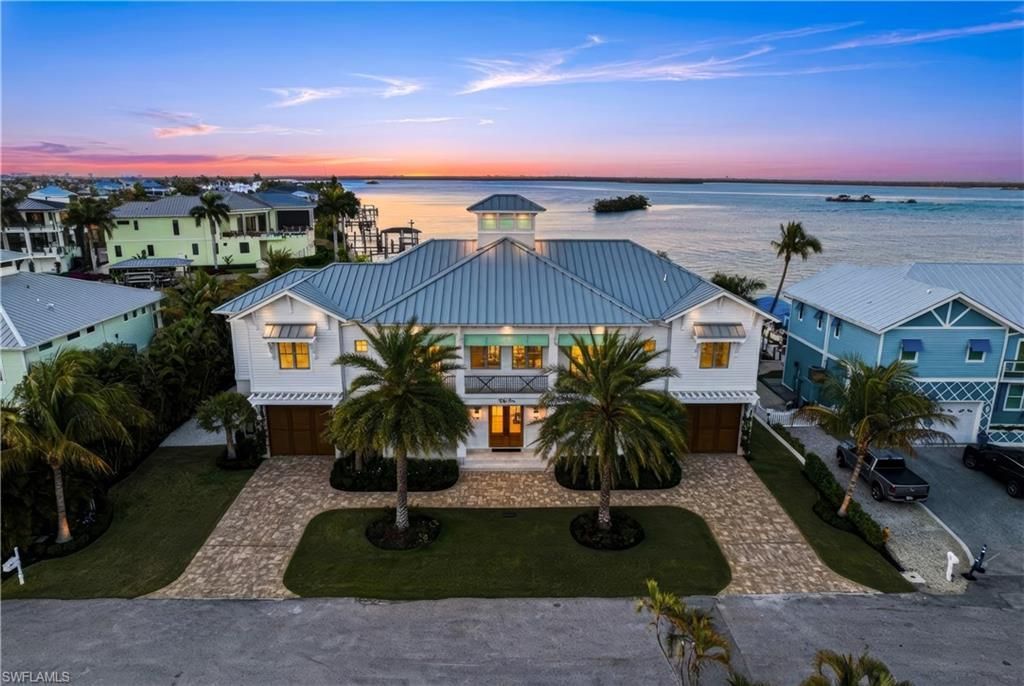 2022-built bayfront masterpiece with deeded beach access and an elevated pool and spa, perfectly positioned on the peaceful south end of Estero Island. Located on an extra-wide homesite with a double-wide driveway, this exceptional coastal retreat offers 120 feet of waterfrontage and sweeping, unobstructed bay views. A true beach and boater’s paradise, the property includes dual boat lifts—a covered 16,000 lb lift and an additional 10,000 lb lift—and is located less than a quarter mile from the sugar-sand shores of Fort Myers Beach. This home features a Galvalume metal roof, hurricane-impact windows and doors, electric storm shutters, and electric sliders that seamlessly blend indoor and outdoor living. The elevated saltwater pool and spa can be heated by gas or electric and showcases a tanning ledge and water features, while the fully equipped summer kitchen with swinging chairs and fireplace creates the ultimate entertainer’s setting. The outdoor space also offers a spacious yard, covered lanai, and expansive dock ideal for fishing and waterfront relaxation. Inside, approximately 3,481 square feet of thoughtfully designed living space includes 3 bedrooms plus an office (or optional 4th bedroom), 4.5 bathrooms, ground-floor flex space, elevator, and garage space for 10+ vehicles. The coastal contemporary interior is meticulously crafted with beautiful oak flooring, soaring ceilings with custom details, a grand wood staircase, and abundant natural light throughout. The chef’s kitchen is beautifully appointed with illuminated Cristallo countertops and backsplash, white and ocean-blue cabinetry, high-end appliances, and a butler’s pantry. The primary suite serves as a private retreat with direct access to the pool deck, stunning water views, a large custom closet, and a spa-like bath featuring Cristallo counters, dual vanities, a soaking tub, and an oversized glass-enclosed shower with multiple showerheads. Additional highlights include an automatic whole-home generator, two tankless water heaters, electric interior shades, Lutron lighting system, and surround sound system. Ideally located on a quiet stretch of South Estero Island near fantastic dining, Lovers Key and Bonita Beach, and just minutes from Times Square and the vibrant energy of Fort Myers Beach, this home represents the pinnacle of waterfront living.