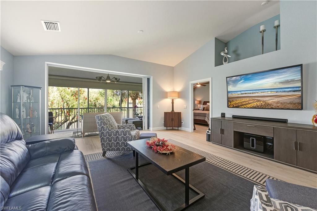 Clubside Reserve at The Vineyards – Second-Floor End-Unit Coach Home. Experience refined living in this exceptional coach home, complete with a two-car garage. This thoughtfully designed and completely refashioned residence offers three bedrooms plus a den, three full baths, open layout enhanced by numerous custom upgrades. Positioned uniquely, the home enjoys added privacy and tranquil surroundings with lake views. The enclosed lanai with triple sliding glass doors creates an expanded living area with additional interior square footage. The renovated kitchen and primary bath showcase quality finishes, complemented by crown molding and custom window treatments, adding timeless elegance and architectural detail. Thoughtful design elements throughout ideal for both entertaining and everyday comfort. Residents of Clubside Reserve enjoy access to a clubhouse featuring and swimming pool & spa, within a welcoming and vibrant community. This is a rare opportunity to own a truly distinctive residence in one of The Vineyards’ most desirable neighborhoods. A must-see property.