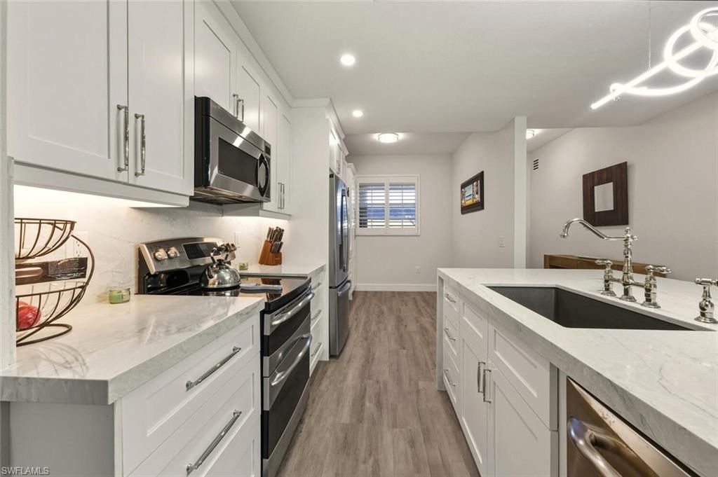 Exceptionally renovated first-floor 2-bedroom, 2-bath condo in Sterling Greens at Glen Eagle featuring peaceful golf course views and a highly desirable southeastern exposure. Enjoy spectacular sunrises and sunshine all day from the screened lanai overlooking the fairway. This residence has been completely renovated—there truly isn’t anything left to do. Updates include new A/C and hot water heater, new appliances, luxury vinyl plank flooring throughout, and a stunning, fully remodeled kitchen with abundant cabinetry, dramatic pompei quartz waterfall countertops, and a designer backsplash. Both bathrooms have been beautifully renovated with high-end finishes as well. Condos renovated to this caliber are rare so get it before its gone.