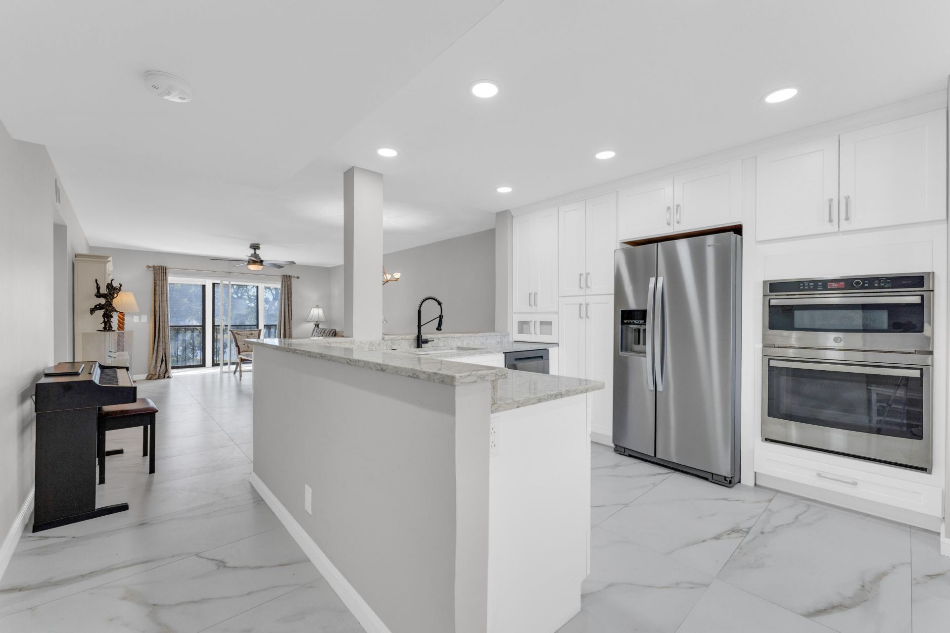 Welcome to this condo w/ stunning pond and lake views. Upon entering, you are greeted by a gorgeous, custom-designed open kitchen that is truly a chef's dream. It features an abundance of new cabinets with pullout drawers, beautiful quartz countertops, and newer appliances, including a built-in wall oven and microwave with convection features and a cooktop range.The interior boasts beautiful oversized porcelain tiles throughout and was recently updated with fresh paint, new baseboards, and new ceiling fans. The popcorn ceilings have also been removed. Both bathrooms have been completely remodeled with new showers, flooring, vanities, toilets, and accessories. Additionally, both bedrooms include closet organizers for your convenience. Gorgeous long lanai w/ serene pond and lake view.