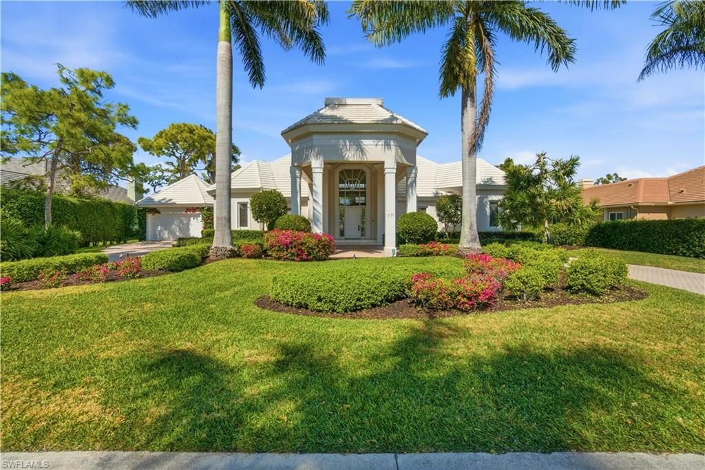 Beautiful estate with spectacular golf course views, ideally located within the coveted Audubon Golf & Country Club in North Naples. Step through the front door and immediately experience soaring 20-foot volume ceilings, elegant marble flooring, and expansive windows that flood the home with beautiful natural light, creating a bright, open, and inviting atmosphere throughout. Thoughtfully maintained, the home features a newer 2019 roof, buried propane tank (2020), and updated HVAC system (2020). The contemporary interior showcases a spacious floor plan featuring 4 bedrooms/den, 5.5 baths, dual living areas with fireplaces, and a stunning formal dining room highlighted by coffered ceilings and beautiful French doors—perfect for both everyday living and entertaining. The renovated chef’s kitchen features quartz countertops, white cabinetry, high-end appliances, and a spacious eat-in area ideal for casual dining or gathering with guests. The outdoor living area offers a true resort-style setting, complete with a spacious pool, spa, tanning shelf, and covered lounging area—all perfectly positioned to capture the stunning golf course views. The primary suite offers ample space for a private seating area, direct access to the lanai, and a luxurious en-suite bath with a large wrap-around walk-in shower. Audubon’s prime North Naples location is just minutes from Mercato and world-class beaches. This prestigious gated and guarded community offers an 18-hole championship golf course, tennis, pickleball, a scenic bayside boardwalk, and a beautifully renovated clubhouse with dining, as well as a second poolside club and café.
